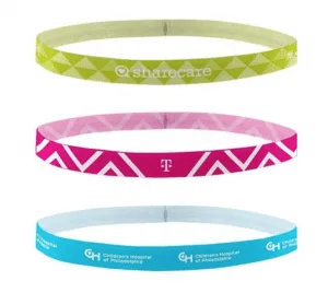 Keep your hair back during downward dog. This stretchy headband can be imprinted in full color with a step and repeat process. Ideal inexpensive giveaway item for class contests or promotions.