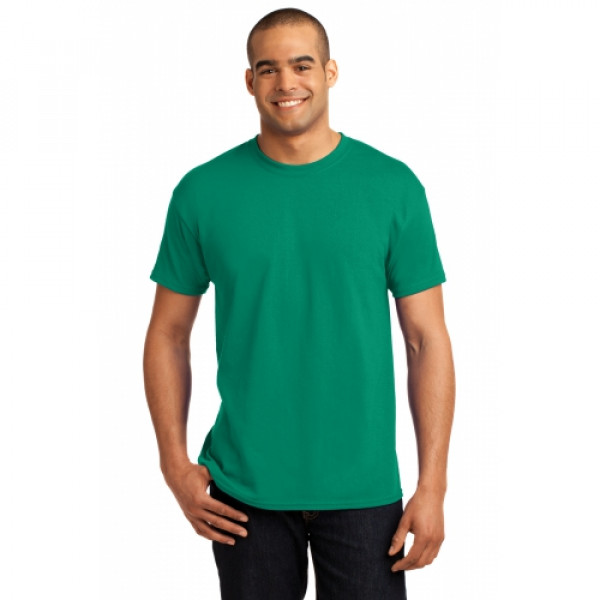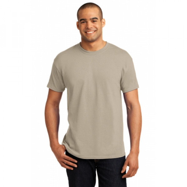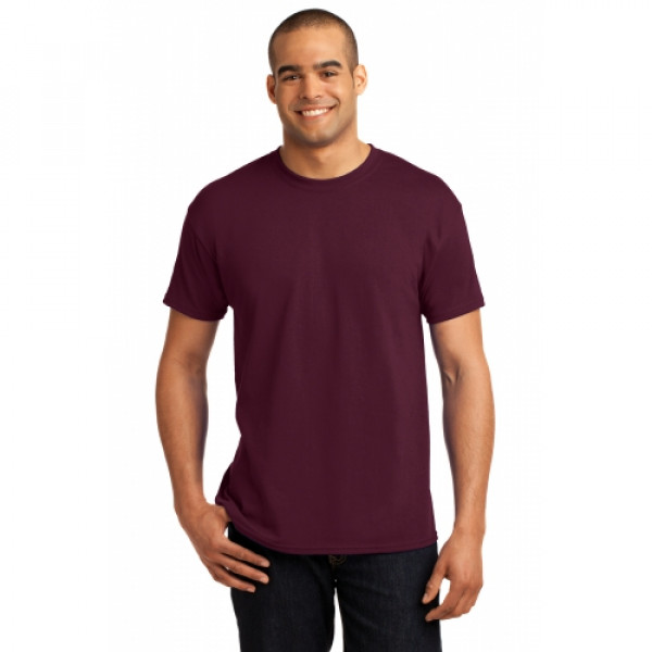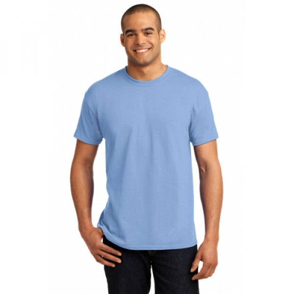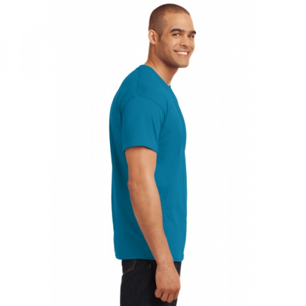 5.2-ounce 50/50 cotton/poly (preshrunk) Taped neck and shoulders Double-needle coverseamed crewneck Double-needle sleeves and hem Hanes EasyColor program haneseasycolor.com