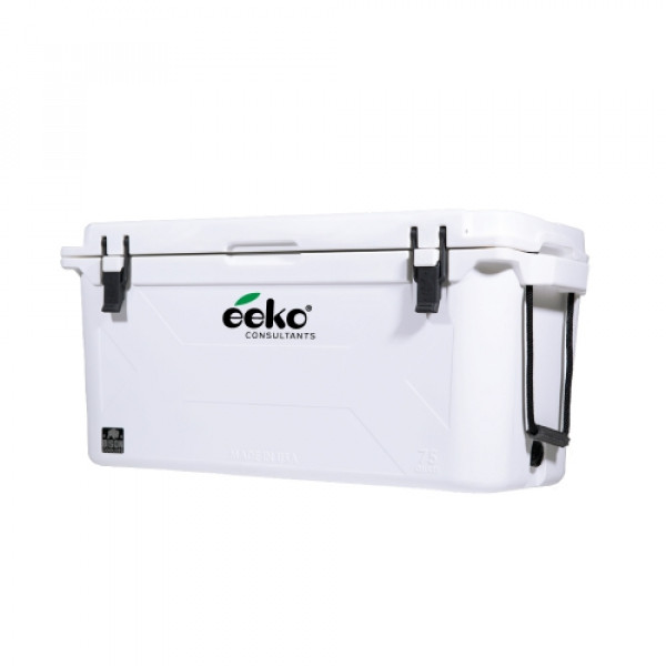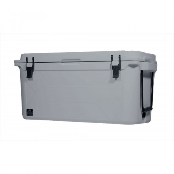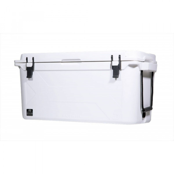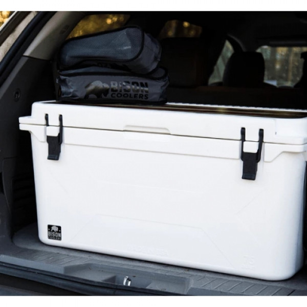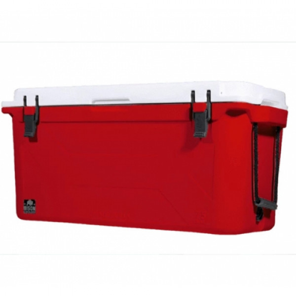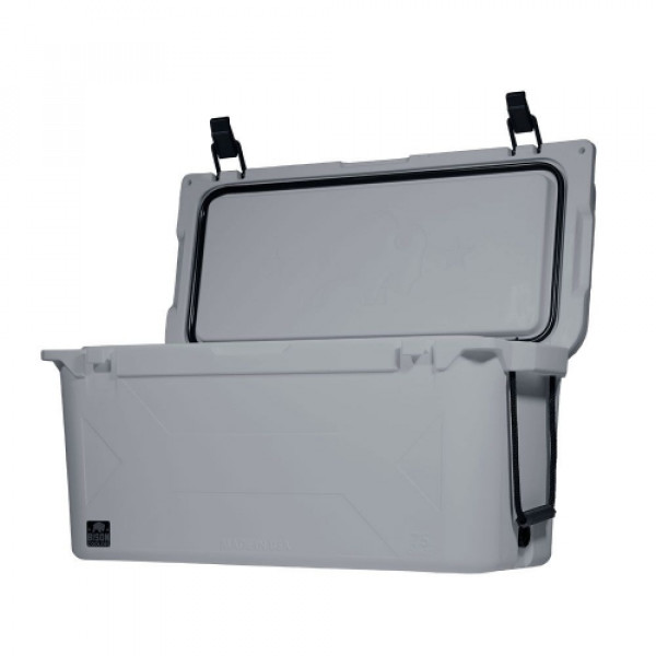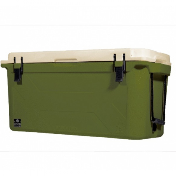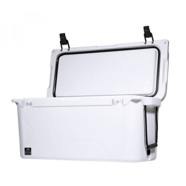 Coolers have one job: keep the items inside at a different temperature than the air outside. The best large coolers do so for days at a time. It's not rocket science, but it requires some logical engineering to ensure your camping cooler does its job. When you're playing hard in the sun all day, you want to know that the drinks in your marine cooler will still be cold. You shouldn't have to use "gentle hands" when loading or unloading a hunting cooler, you shouldn't have to add ice every couple of hours, and you sure as heck shouldn't have to buy a 75 quart rotomolded cooler made anywhere other than in the United States.::Made in the USA to support fellow Americans.::Constructed as one piece, Bison rotomolded coolers won't fall to pieces.::Drinks stays cold and food stays fresh inside two-inch thick insulated cooler walls.::Silicone, shark-fin gasket seals cold air inside the ice chest.::Oversized drain plug makes for easier cooler cleaning.::Rope handles provide a more comfortable grip.::Durable latches keep the lid shut tight and nosy critters out.::Skid-preventing rubber feet means your Bison stays where you put it.::Lockable lid prevents strangers from helping themselves to your beer.::Customizable lid shows off your personality.::Easy to strap down for bumpy roads on the back of an ATV.::Your long-lasting cooler investment is backed by a 5-year warranty.::Capacity: 63 12-oz. cans at a 2:1 ice-to-drink ratio or 96 lbs. of ice