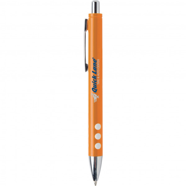 Add a pop of color to your next campaign with this vibrant writing instrument! Featuring fun sorbet tones contrasted with sleek white and chrome trim, this pen is as eye-catching as it is functional. Its jumbo barrel and raised white dot grip provide a comfortable writing experience, while the strong click mechanism and smooth black ink ensure reliability. A great promotional product, this pen can be custom branded to keep your message in hand and on display.