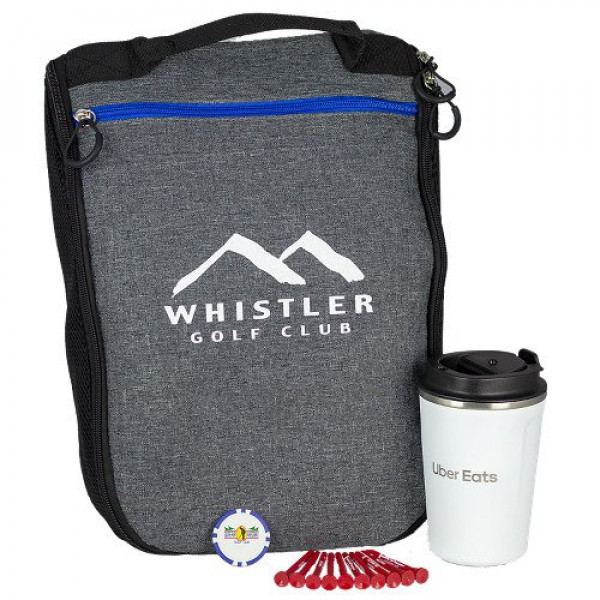 This kit includes: URBANSHOE- Urban Shoe Bag, ONYX- 13 oz Stainless To-Go Coffee Tumbler, POKERCHIP- Poker Chip Ball Marker, GTP10T- 10 Tall Golf Tees Packaged