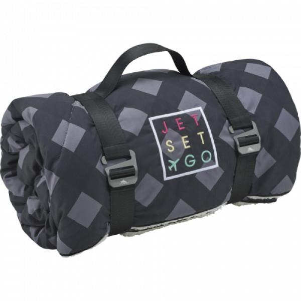 Stay warm and cozy with this versatile roll-up puffy Sherpa blanket, designed for both indoor and outdoor use. Featuring a three-layer quilted construction, it offers superior warmth and comfort. The stylish water-resistant plaid top layer, cotton insulation, and soft Sherpa backing make it perfect for picnics, camping, or relaxing at home. Conveniently rolled up with durable nylon straps and secured with laser-engraved High Sierra aluminum clips, this blanket is easy to carry wherever you go.