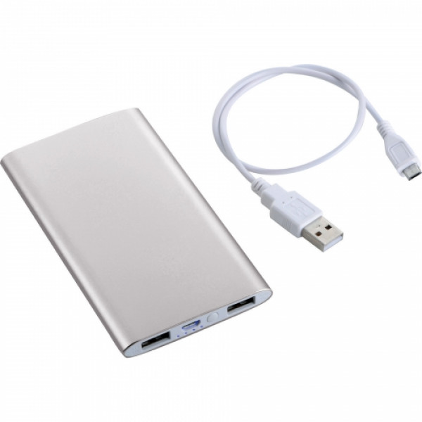 The Sleek Aluminum 4,000 mAh Power Bank is a rechargeable lithium-polymer Grade A battery device that’s powerful enough to charge smartphones, MP3 players, and tablets with a total output of 5V/2A. Why you'll love the Sleek Aluminum 4,000 mAh Power Bank:::Dual output allows you to charge two devices simultaneously::Includes a battery check button to ensure that you know how much battery life is remaining::Power bank charges via a USB cable (included) which can recharge the battery backup or be used to charge devices with a micro-USB input like Android smartphones::Input: 5V/1000mA::Output: 1:5V/2000mA; 2:5V/1000mA::Media device not included