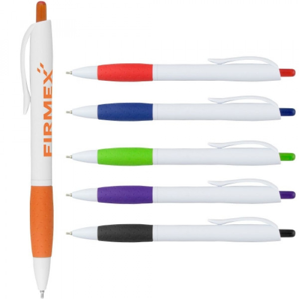 ::24 HR Rush available for up to 3,000 qty; 48 HR Rush available for up to 5,000 qty::This pen features a high gloss white barrel contoured to fit comfortably in your hand::It comes with a Super Glide refill that provides an exceptional writing experience, delivering a consistent ink flow to produce non-skipping writing and a smooth fine writing line::Rubber gripper provides comfortable hold and extra control::Features a matching plastic plunger
