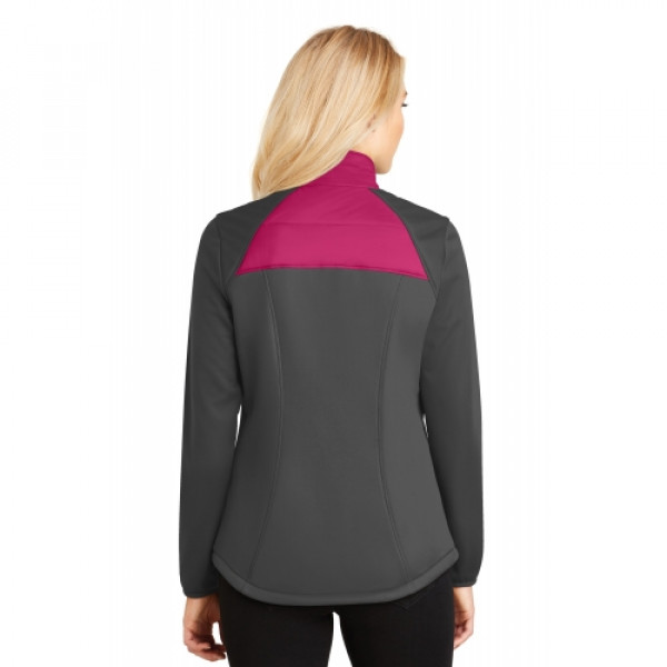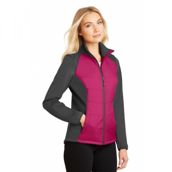Quilted front and back panels join a water-resistant soft shell to make the Hybrid a trend-right performance jacket with an urban edge.::100% polyester knit shell bonded to a water-resistant film insert ::100% polyester microfleece interior::100% nylon woven overlays with quilted 4-ounce, 100% poly fill insulation at center front and back panels::Reverse coil zippers::Zip-through cadet collar with chin guard::Zippered right chest pocket::Front zippered pockets::Left chest Port Pocket™ for easy embroidery access::Comfort fit binding at cuffs::Open hem with adjustable locking drawcords