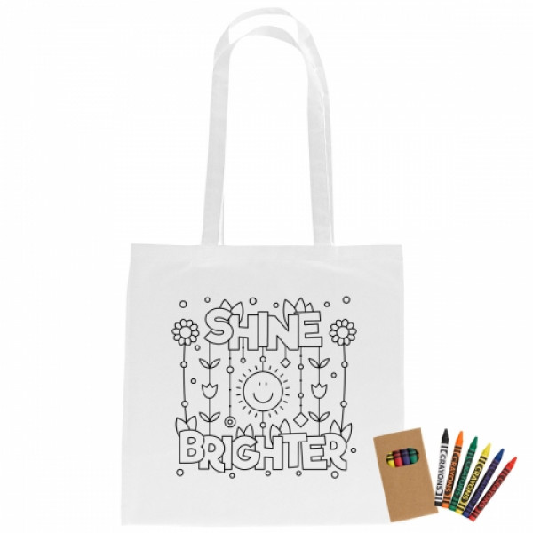 ::Create Your Custom Coloring Bag Design Or Choose From Our Stock Designs!::Made Of 4 Oz. 100% Natural Cotton::30" Handles::Includes 6-Pack Of Crayons. Crayon Colors Include: Black, Blue, Green, Orange, Red And Yellow.