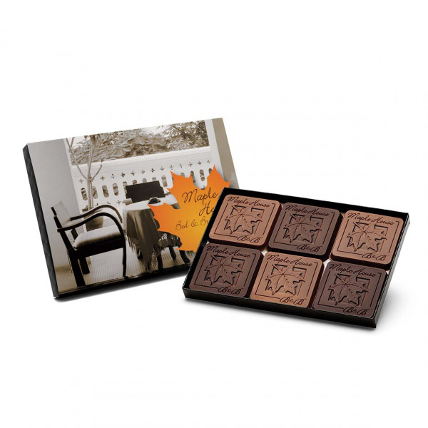 This elegant chocolate ensemble is a mid-sized favorite that combines delicious flavor with standout presentation. Featuring six engraved chocolate squares nestled in a two-layer box, it makes a tasteful and memorable promotional product for client gifts, events, or holiday celebrations. The complimentary packaging includes a full-color custom gift band to showcase your brand, with optional upgrades available for a more personalized touch.