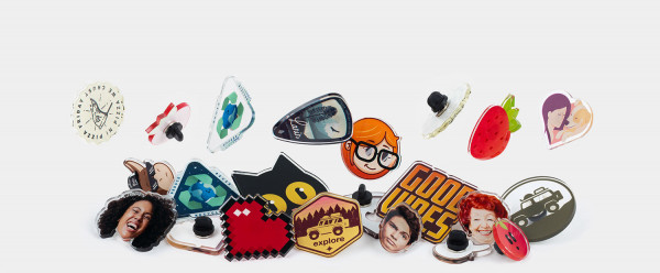 Custom acrylic pins are a great alternative to enamel pins at a fraction of the cost. Each pin is made from an acrylic material that can be printed in full color and personalized to any shape.