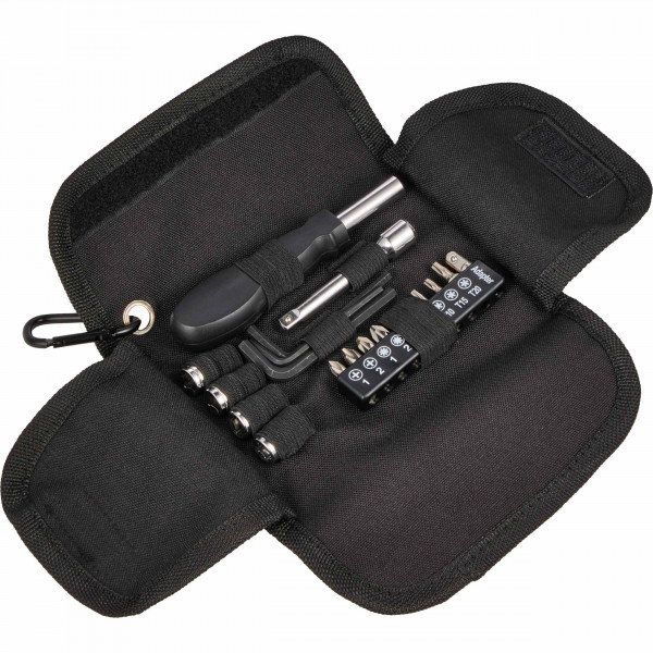 This 19-PieceTool Set is travel-ready and up for any job. Set includes: a screwdriver handle, a screwdriver connector, 3 hex keys, 4 sockets and 10 driver bits. All of which fits nicely in the fold up rPET pouch with hook-and-loop clasp. Set also includes a clip-on carabiner, perfect for hanging storage or attaching to utility bags.