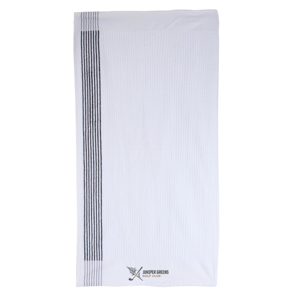 Want to look like a pro on the course? This 22" x 44" Caddy Golf Towel is the perfect accessory to elevate your game and makes an excellent promotional product that can be custom branded with your logo. Made from a soft, durable cotton/polyester blend, it features classic side stripes for a standout look. The ribbed texture enhances absorbency, while the oversized design provides plenty of space for multiple uses—wet one end to clean clubs while keeping the other dry for hands or face. Conveniently drape it over your clubs for easy access during play.
