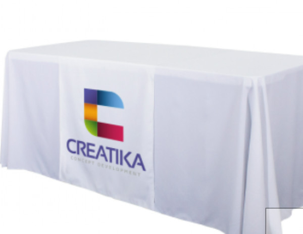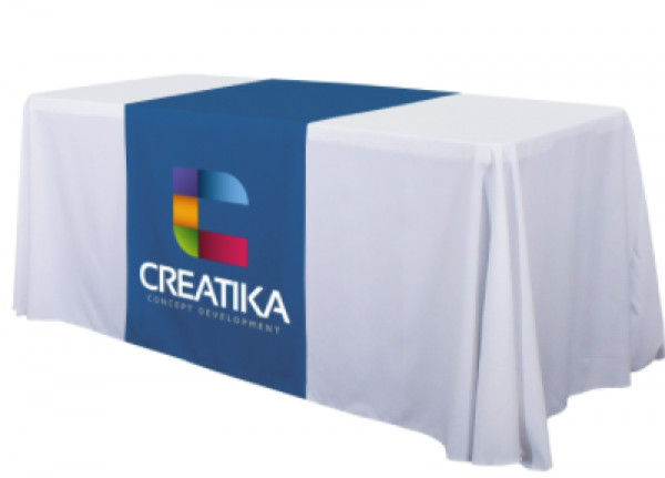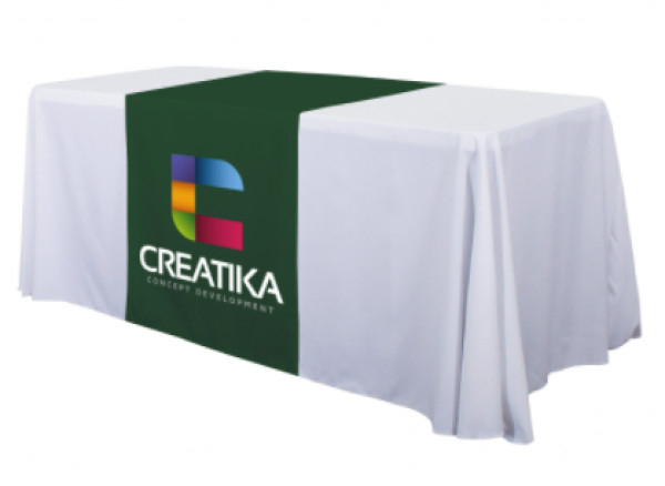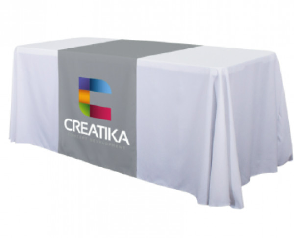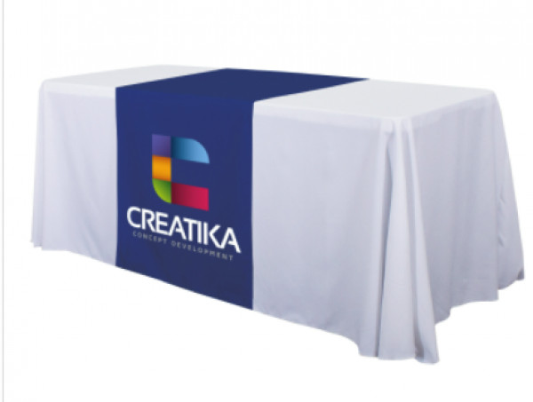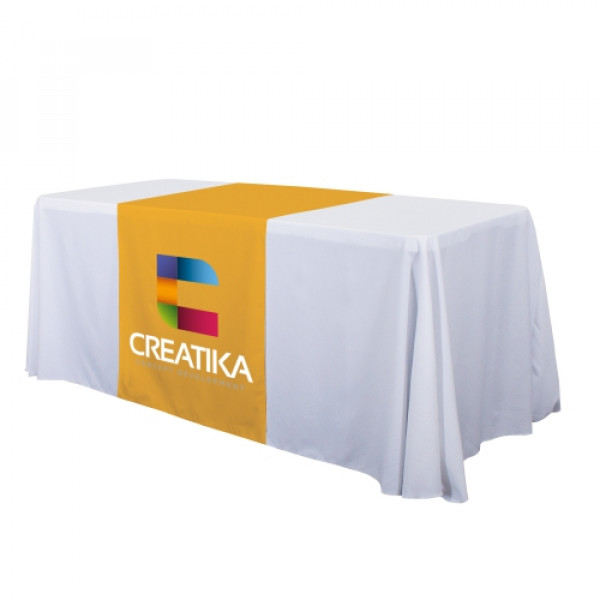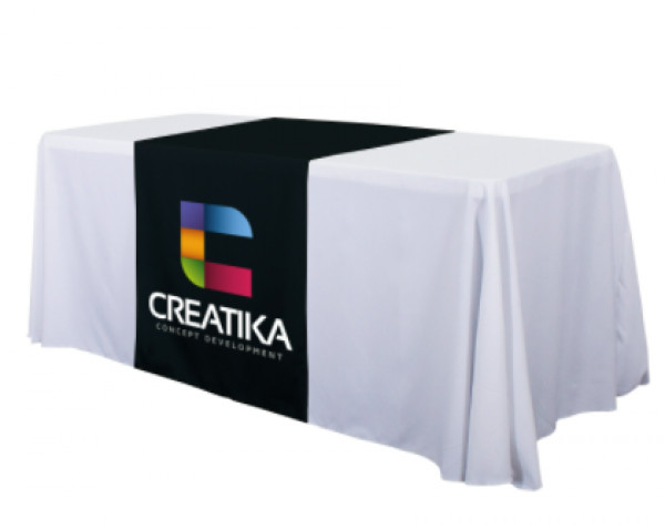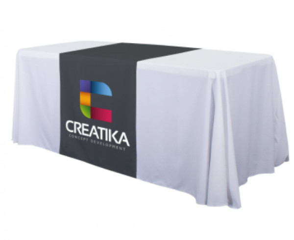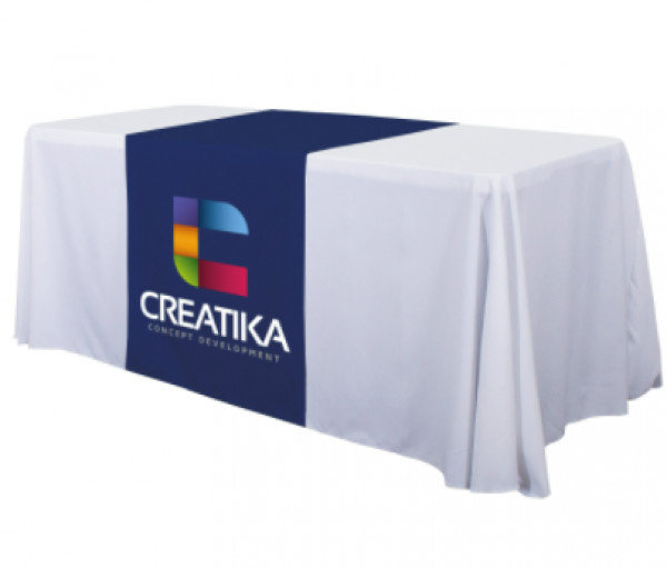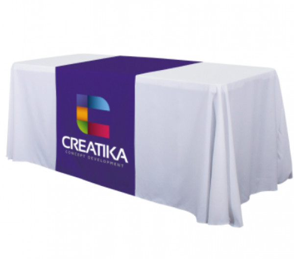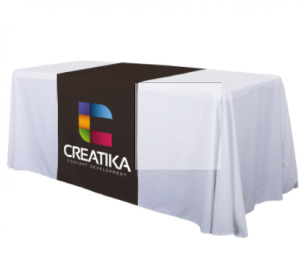 These cost-effective throws are laser-cut for a crisp, finished edge.::Heat-treated edges will not fray or unravel::Printed on polyester poplin::Flame retardant treated (FR rated for exhibit halls)::Can be used alone or with a blank table throw::28” length offers tabletop-to-floor coverage on both sides of the table