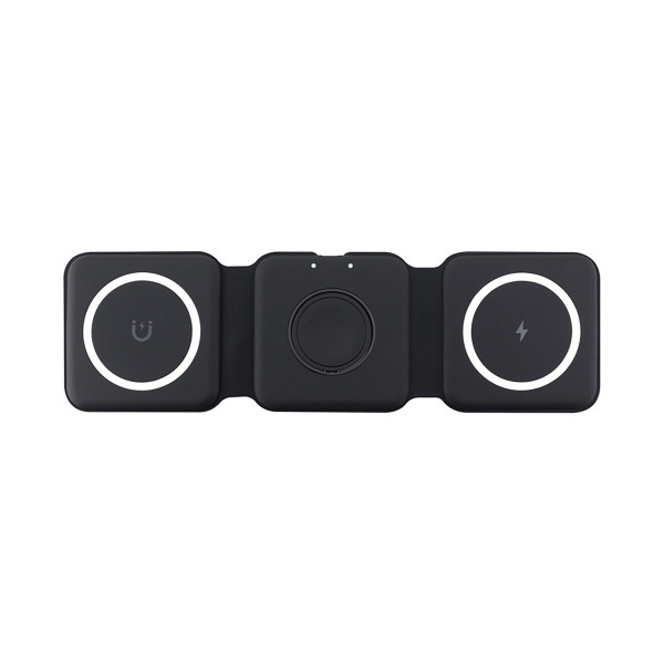 The 3-in-1 Travel Charger keeps you powered wherever you go with its sleek, portable design. This wireless charging mat charges your phone, earbuds, and smartwatch simultaneously and works with both Apple® and Samsung® devices. With a Type-C input (cord included) and outputs of 3W, 5W, and 15W, it delivers efficient charging. Ideal for travel, it ensures convenience and reliability. Note: Some computer USB ports may lack sufficient power for charging.