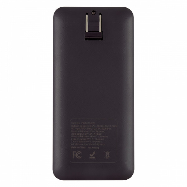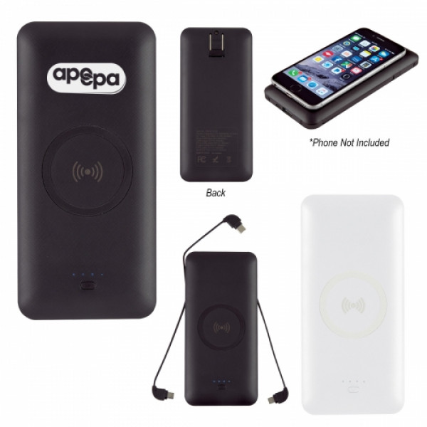 ::Charge Qi Enabled Devices Wirelessly By Placing Compatible Device On Top Of Power Bank::5000 mAh Lithium Ion Grade A Non-Recycled Battery::Indicator Lights::Features A USB Output And Micro USB Input (Adapter Built In)::Output: 5 Volts/1 Amp::Includes Flip-Out 8-Pin, Micro USB And Type C Cables::Compatible With Apple® 8-Pin, Micro USB And Type C Devices::Charge Multiple Devices At Once When Using An Ample Power Source::Charges Most Phones, MP3 Players And More!::Apple is a trademark of Apple Inc., registered in the U.S. and other countries.