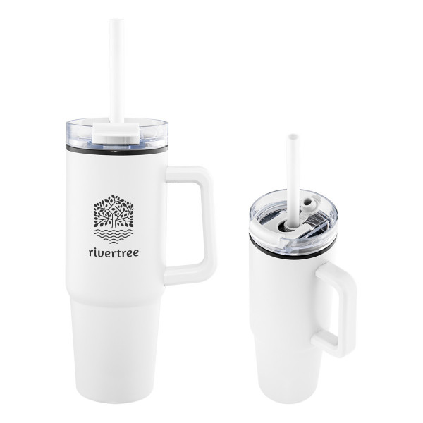 Enjoy your favorite beverages on the go with the 30 Oz. Intrepid Recycled Tumbler. Designed with both style and sustainability in mind, this eco-friendly drinkware is perfect for keeping drinks hot or cold while showcasing your brand as a custom promotional product. With a comfortable handle, durable powder-coated finish, and a spill-resistant lid with straw, it’s built for everyday use.