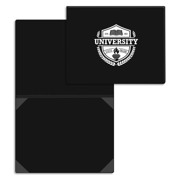 Elevate the presentation of important documents with this handsome certificate holder, designed to impress at seminars, trade schools, chambers of commerce, and more. Bound at the top for a classic look and constructed with recycled chipboard for added stability, it’s the perfect promotional product to showcase your brand with custom decoration. Designed to securely hold an 8.5" x 11" insert, this USA-made holder combines functionality with a professional finish.