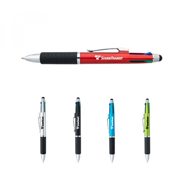 The 4 in 1 Pen with Stylus gives you 4 ink options and the convenience of a stylus in 1 product! This multifunctional pen is a perfect trade show giveaway idea! ::4 ink colors::Handy stylus::Rubber grip For writing comfort and control