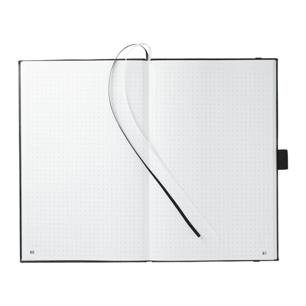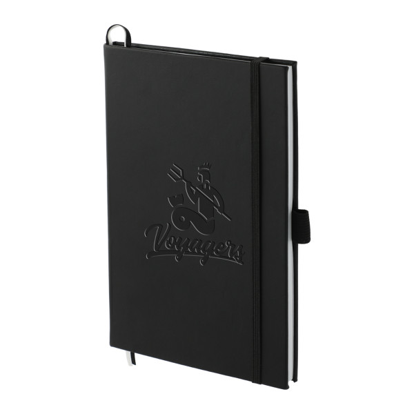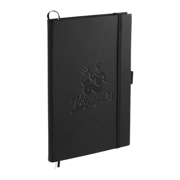 Features a square, cornered hardbound cover with color-matching elastic closure and pen loop.