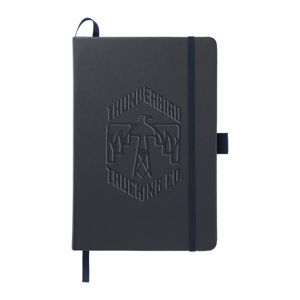 The 5.5” x 8.5” FSC® Mix Mela Bound Journal features a uniquely crafted hard cover with 39% of apple components. Color-matching elastic closure, pen loop and ribbon page marker. Includes 80 sheets of FSC® Mix white lined recycled paper and back document pocket. Through a partnership with 1% For The Planet, one percent of sales of all EcoSmart® products will be donated to environmental nonprofits.