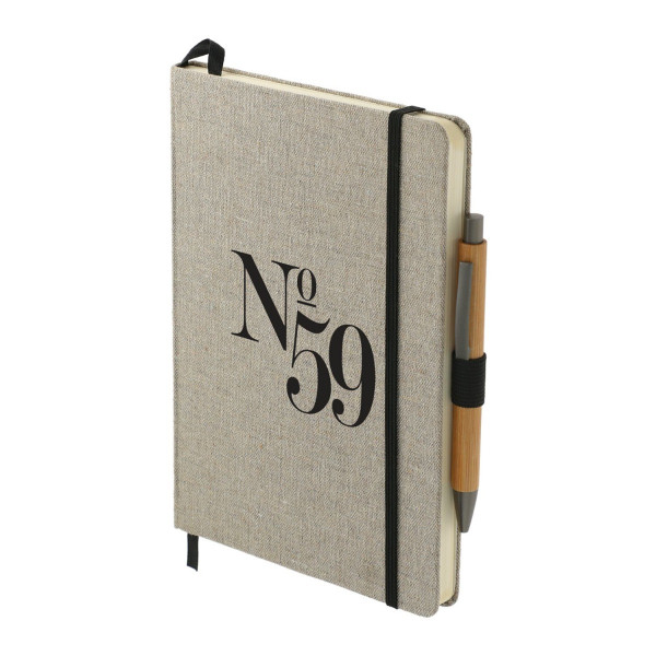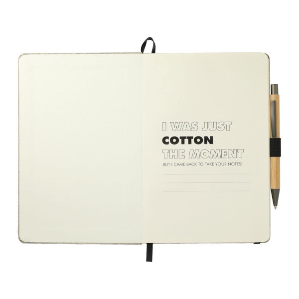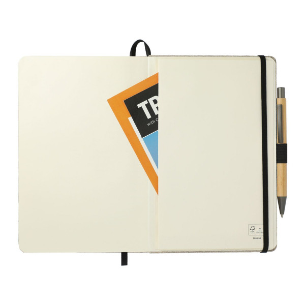 The 5.5'' x 8.5'' Recycled Cotton Bound Journal Set includes (2800-94) 5.5'' x 8.5'' Recycled Cotton Bound Journal and (1066-49) Bamboo Quick-Dry Gel Ballpoint. The 5.5'' x 8.5'' Recycled Cotton Bound Journal is the perfect journal for all of your notetaking needs. Features a recycled cotton, hard cover. Natural color elastic closure, pen loop and ribbon page marker. 80 sheets of FSC® Mix cream lined paper. Back document pocket. FSC label printed inside. Through a partnership with 1% For The Planet, one percent of sales of this and all EcoSmart® products are donated to environmental nonprofits.