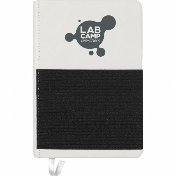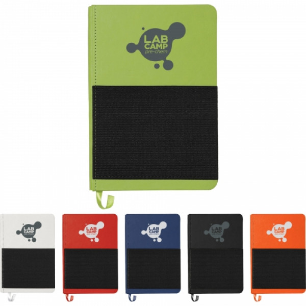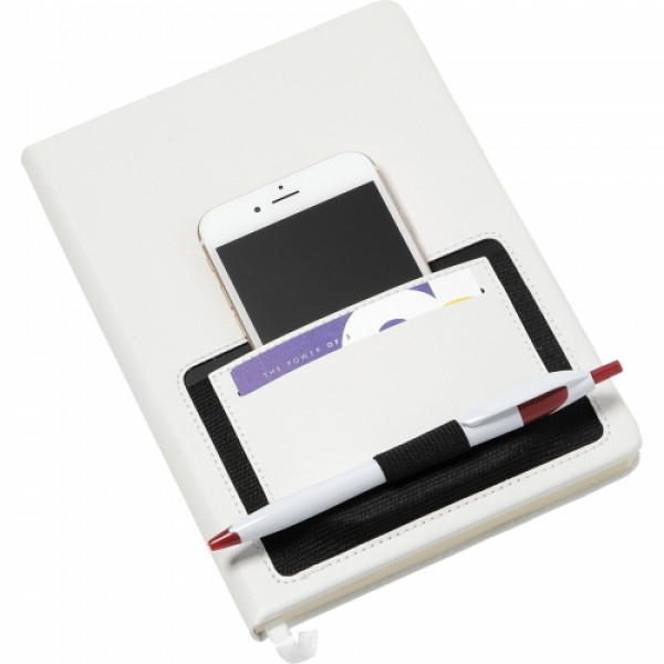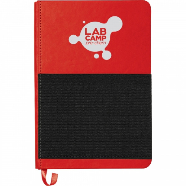 Hard bound journal. Color matching ribbon page marker. Front elastic pocket to hold smartphone pocket, documents and pens. 80 sheets of cream lined pages.::Pen and phone not included