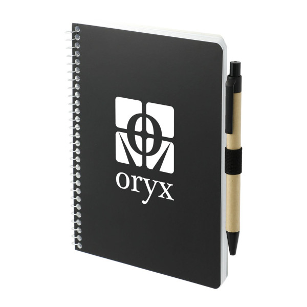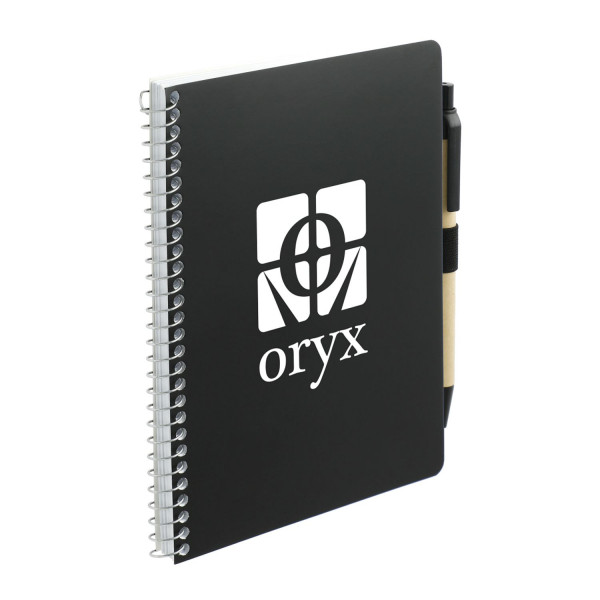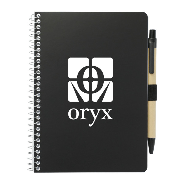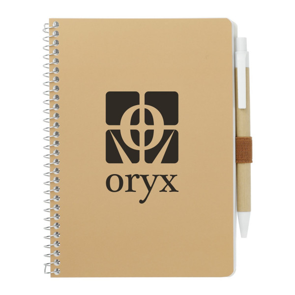This eco-conscious 5” x 7” FSC® Mix Spiral Notebook with Pen is the perfect sustainable choice for your next branded giveaway or promotional product. With a soft kraft paper cover and responsibly sourced lined pages, it's ideal for taking notes at meetings, in class, or on the go. The notebook comes with a matching pen and a convenient pen loop, making it a practical and stylish option for customization.
