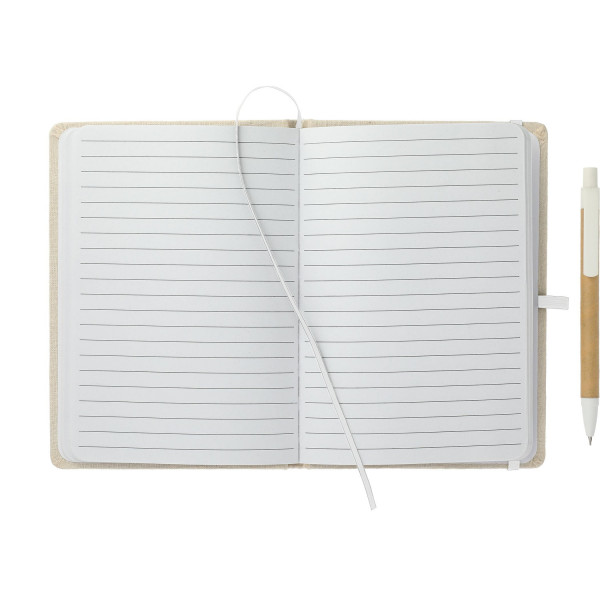 The 5" x 7" Organic Cotton Bound Notebook with Pen is an eco-conscious promotional product perfect for showcasing your brand in a sustainable way. Featuring a durable hard cover made from 80% recycled organic cotton, this notebook combines natural style with functionality. It includes a matching recycled barrel pen with black ink, ideal for meetings, giveaways, or eco-friendly corporate events.