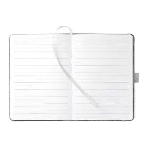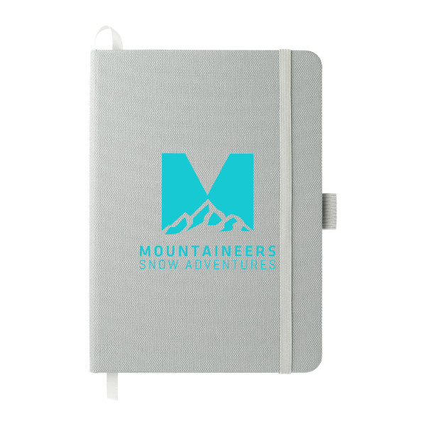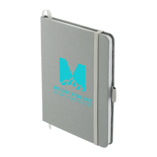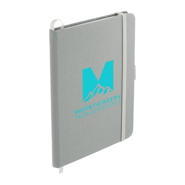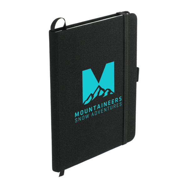 The 5" x 7" Recycled PET Bound Notebook features a 600D RPET cover with color matching elastic pen loop, closure and ribbon page marker.
