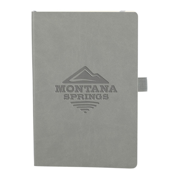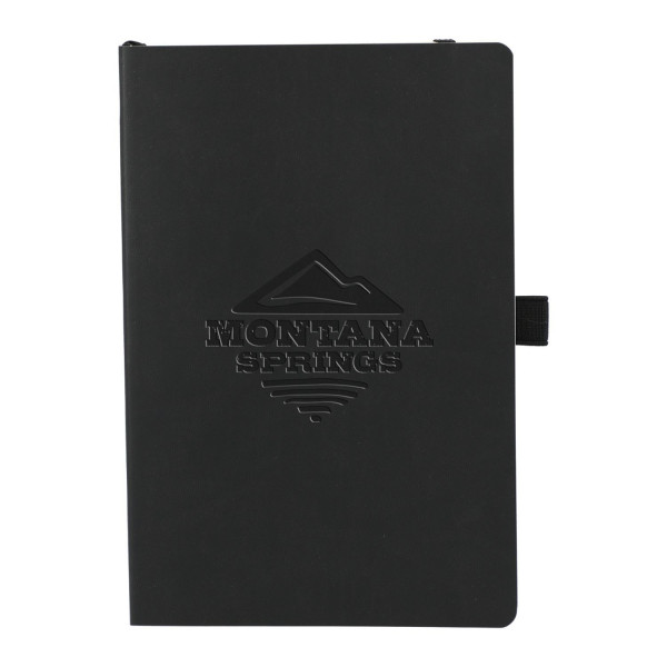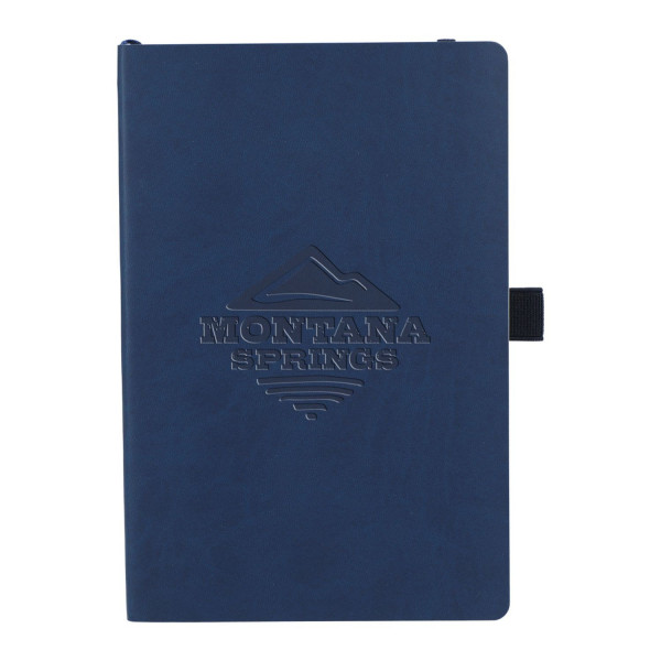 The 5.5'' x 8.5” Skiva Recycled Soft Bound Journal features a recycled polyurethane cover and 80 pages of recycled cream lined paper. Includes document pocket, color matching elastic band, pen loop and ribbon page marker.