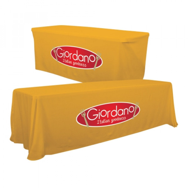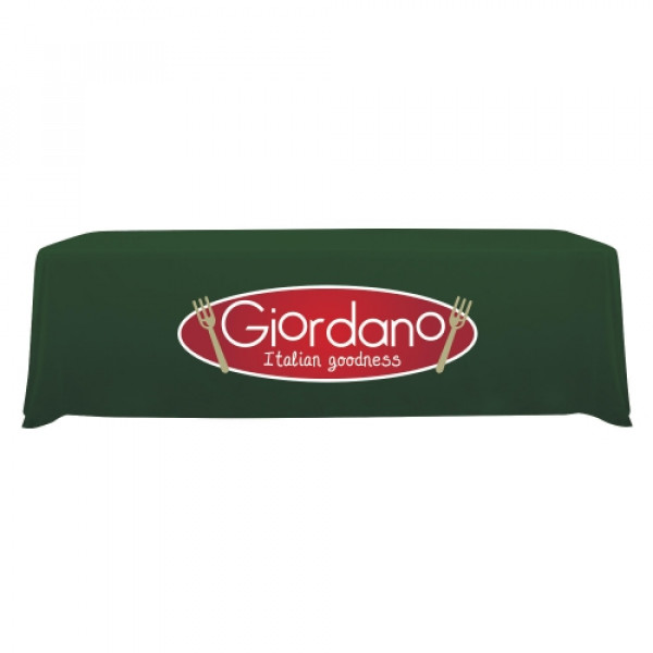 This throw is easily convertible so it fits both 8' and 6' table sizes. Simply fold the edges and attach them to hook-and-loop strips on the back of the throw.::Your graphic will be imprinted on the front of the table throw::Draped look for 8' tables, fitted look for 6' tables::Covers four sides of the table::Polyester poplin fabric::Flame retardant treated (FR rated for exhibit halls)::Machine-washable; do not dry clean and do not iron::One-year product warranty::Product Size : 96 in (W) x 28 in (H) x 30 in (D)::Product Size Converted to 6ft Throw : 72 in (W) x 28 in (H) x 30 in (D)