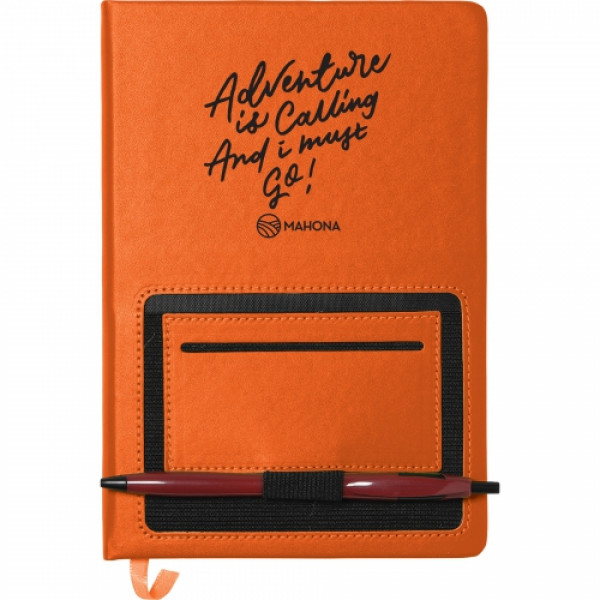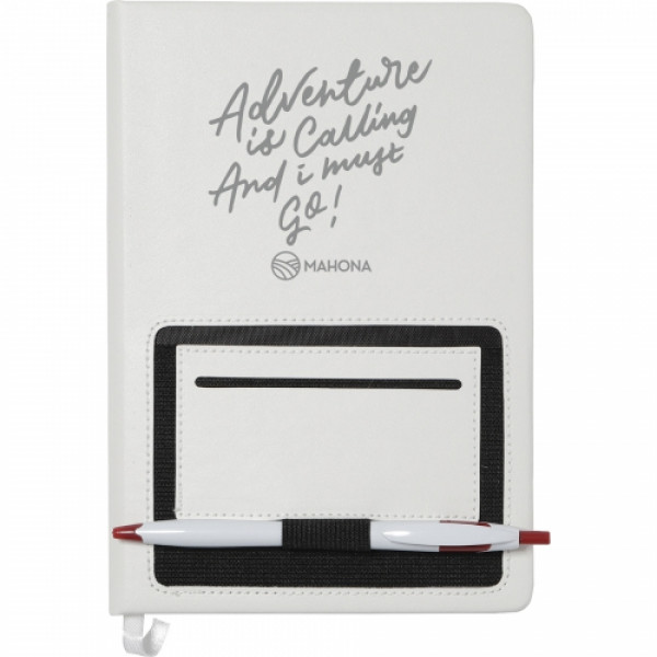 Hard bound journal. Color matching ribbon page marker. Front pocket to hold smartphone and business card slot. Elastic pen loop. 80 sheets of cream lined pages.::Pen and phone not included