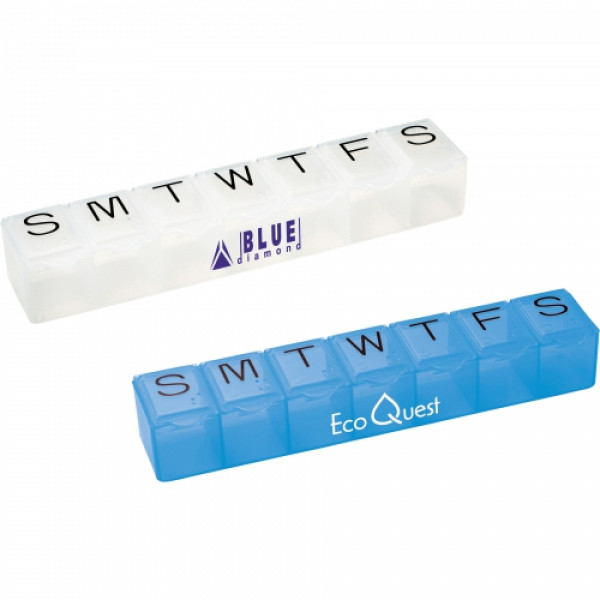 ::Pill storage box features seven compartments. ::Each day of the week is conveniently labeled on the hinged, snap-up lid.