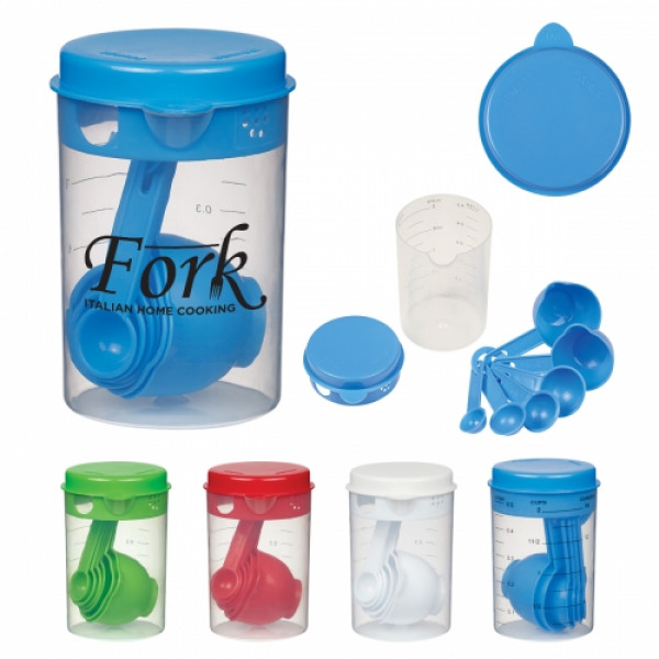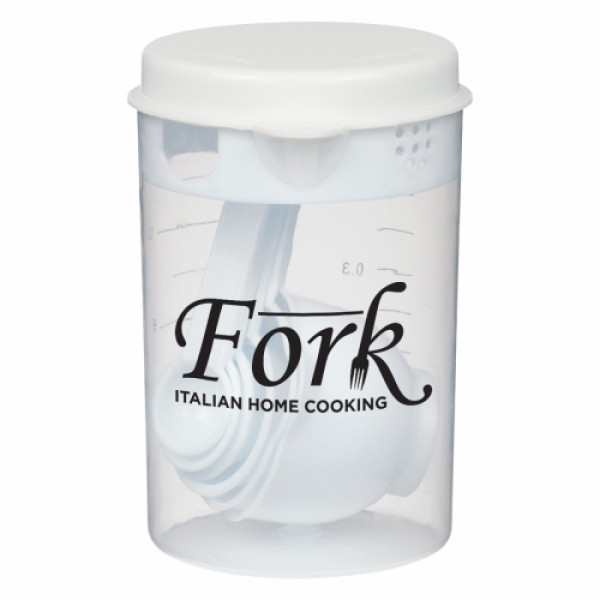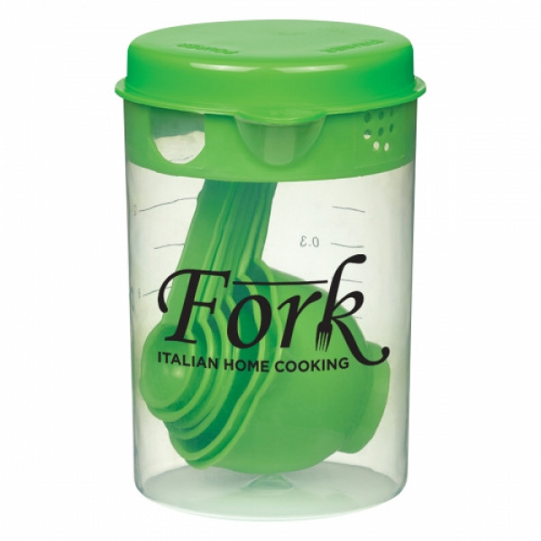 ::Measurements: 2 Cup, ⅓ Cup, ¼ Cup, 1 Tablespoon, ½ Tablespoon, 1 Teaspoon, ½ Teaspoon::2 Cup Container Includes Ounce And Liter Markings::Includes Lid With Closed, Strain And Pour Options::Set Stores Within Itself To Save Space::Meets FDA Requirements::BPA Free::Hand Wash Recommended