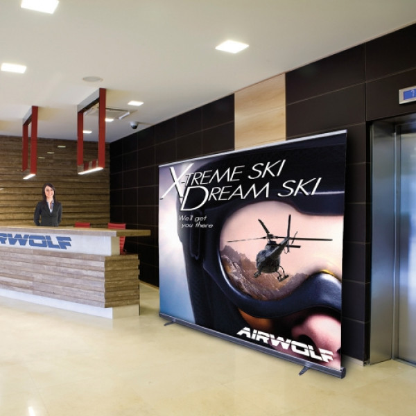 Create an impressive backdrop with this ultra-wide retractable banner.::Two-person setup::Heavy-duty base is available in silver only::Two swivel feet for stability::Two shock cord poles support the banner::High-tension base springs keep the banner taut::Banner attaches with snap rail on top and banner tape on bottom::Artwork is dye sublimated on Titan™ no-curl fabric::Banner is single-sided::100 RCAT rating