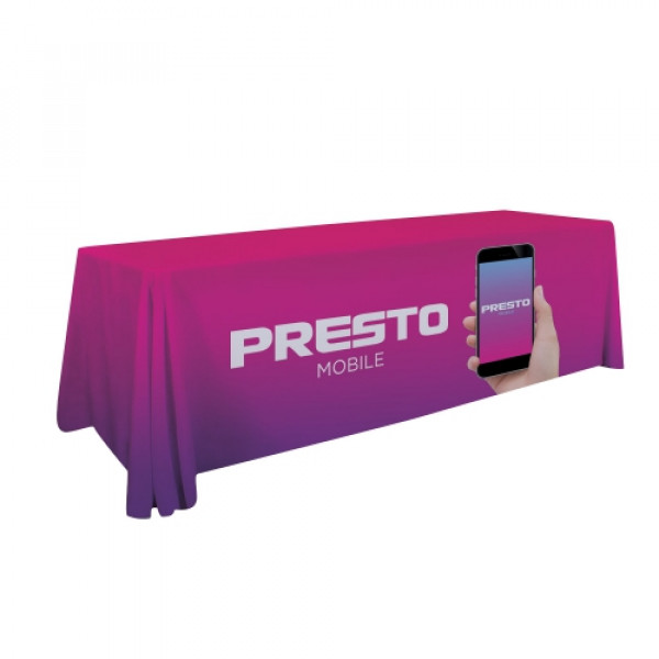 With an upscale, wrinkle-free look, Premium throws are perfect for showcasing eye-catching, full-color imagery.::For use with tables 8' wide::Covers four sides of the table::Draped corners::Two-way stretch fabric is nearly opaque, so shine-through is virtually eliminated::Artwork is dye sublimated across full table throw