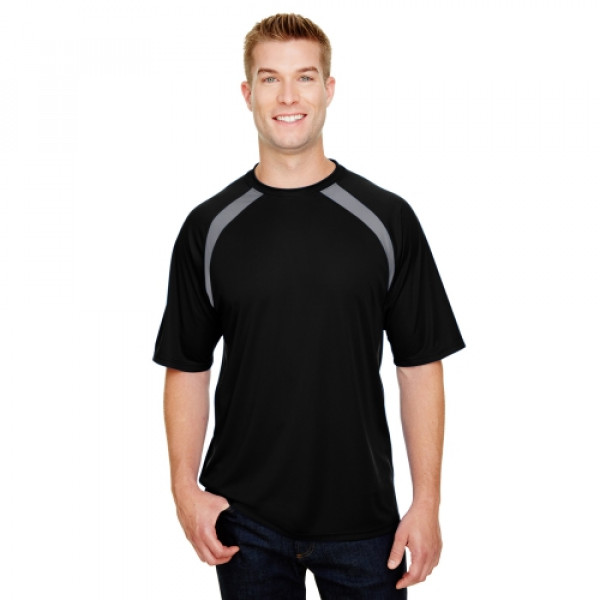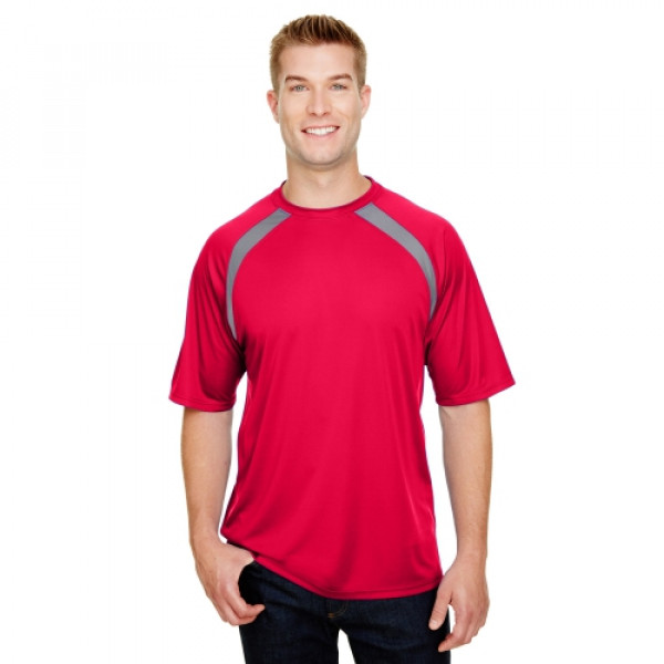 Fabric:::4 oz., 100% micro poly interlock::Superior moisture wicking for peak performance::Stain release and odor resistant for easy care::Fade and snag resistant for durability::30+ UPF for UV sun protectionFeatures:::Ultra-tight knit for better opacity and printability::Double needle cover stitch hem