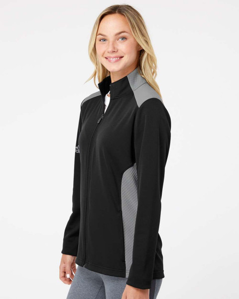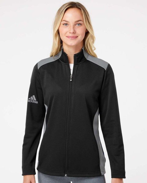 The adidas Women's Textured Mixed Media Full-Zip Jacket combines performance and style in a sustainable design. Made from 100% recycled polyester at 8 oz./yd², it features waffle-textured shoulder panels and back for added detail. Two front zippered pockets provide secure storage, while the open hem cuffs and bottom hem offer a comfortable fit. Finished with a contrast adidas logo on the right sleeve, this jacket delivers both functionality and a polished look.