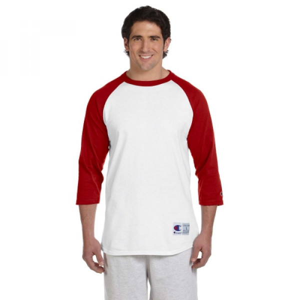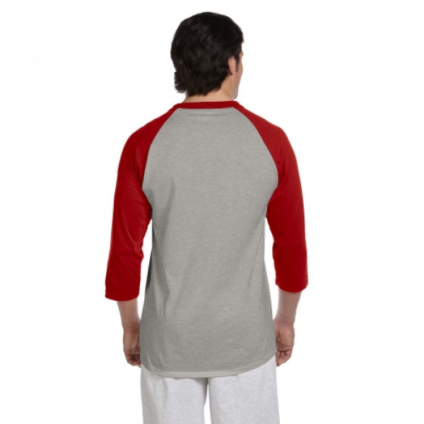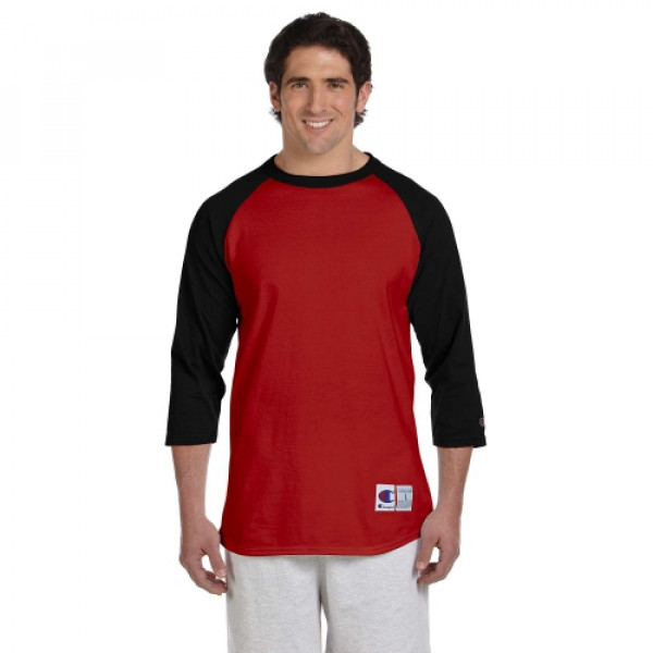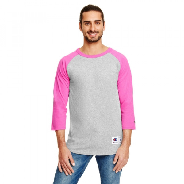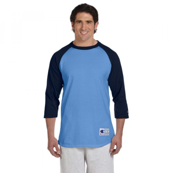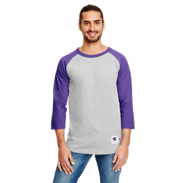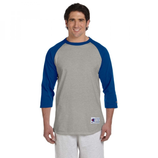 ::100% cotton::Tag-free neck label::Contrast rib collar and 3/4-raglan sleeves::“C” logo on left sleeve::Double-needle sleeves and bottom hem::Exterior jock tag at left hem::Oxford Gray is 90% cotton, 10% polyester