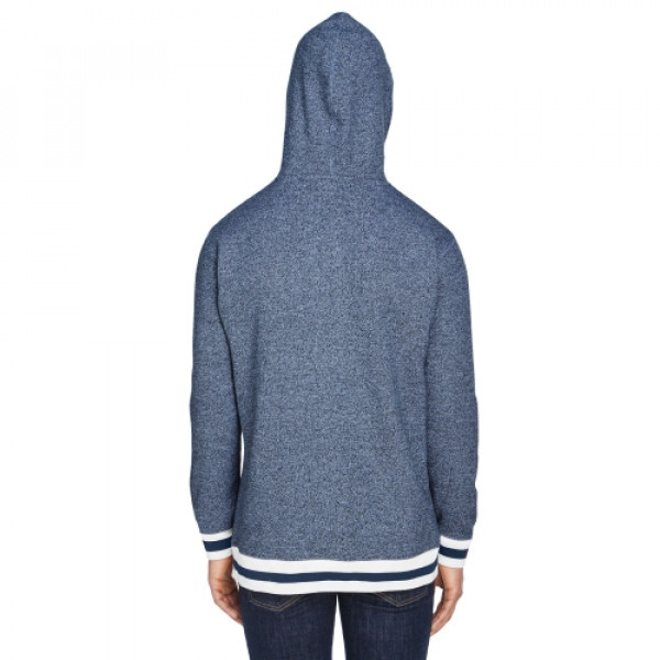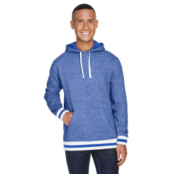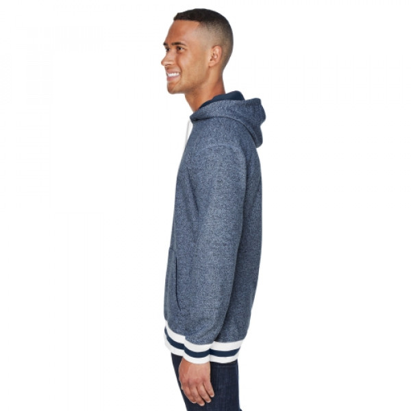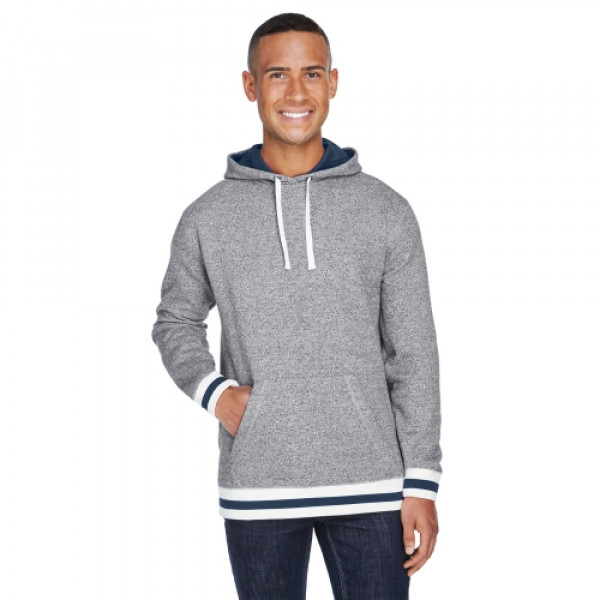 Fabric:::9.25 oz., 80% cotton 20% polyester heathered fleeceFeatures:::1x1 yarndyed cuffs and waist::Lapover neckline with contrast lined hood::Set-on pouch pocket