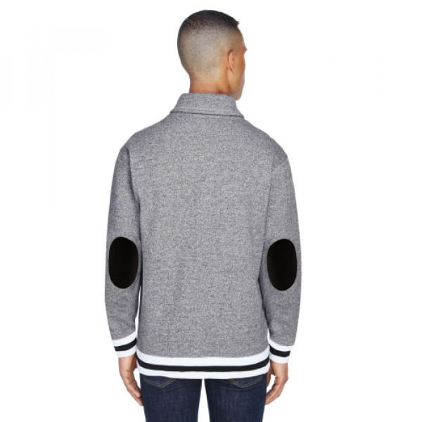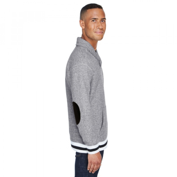 Fabric:::9.25 oz., 80% cotton 20% polyester heathered fleeceFeatures:::1x1 yarndyed cuffs and waist::Unique shawl collar design::Contrast fleece elbow patches::Set-on pouch pocket