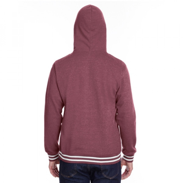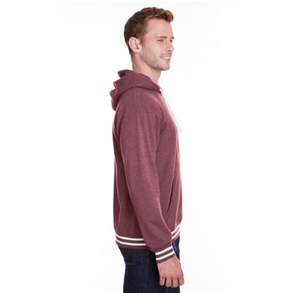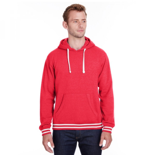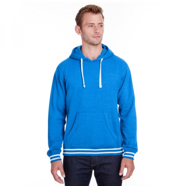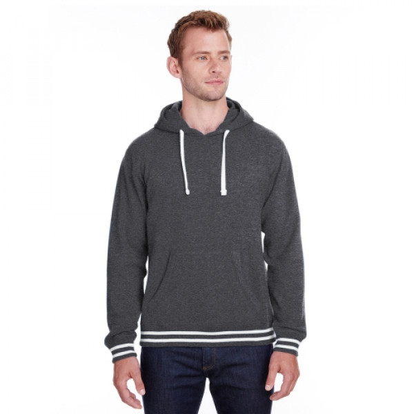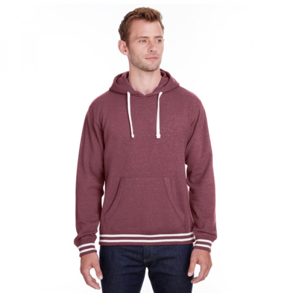 ::6.5 oz., 60% cotton 40% polyester single-dyed fleece::1x1 rib yarn-dyed stripe cuffs and waist::off white drawcords::set-on pouch pocket