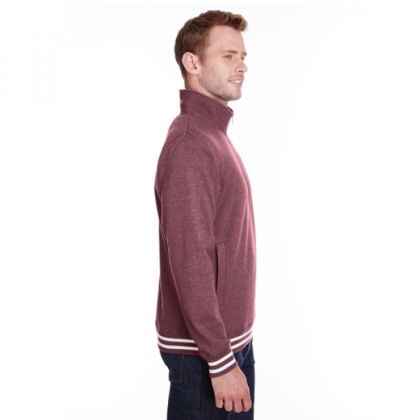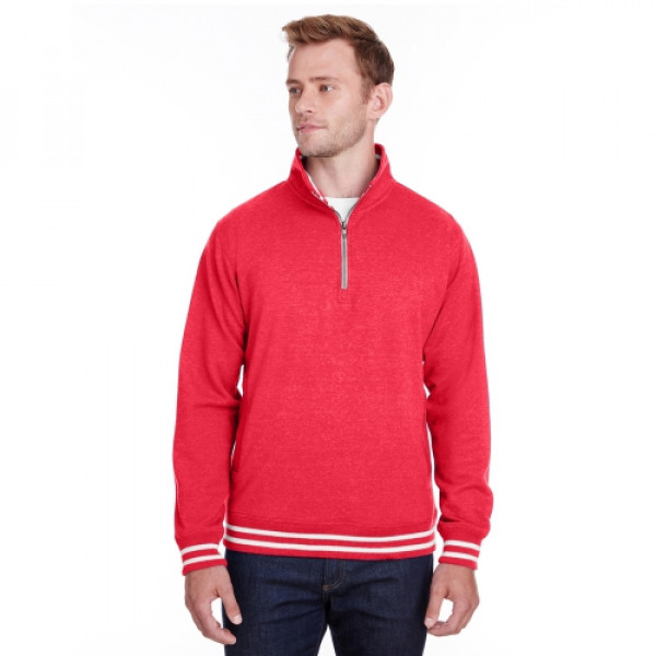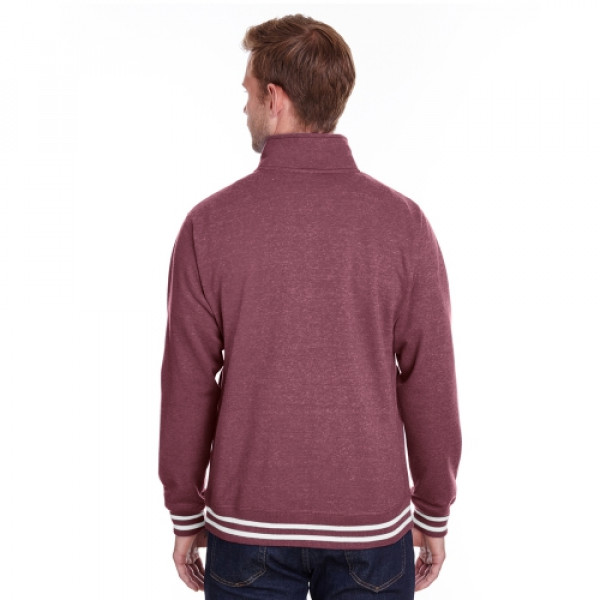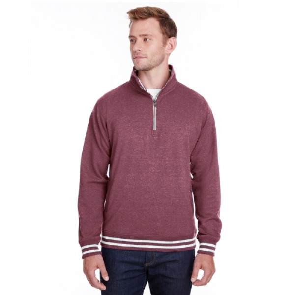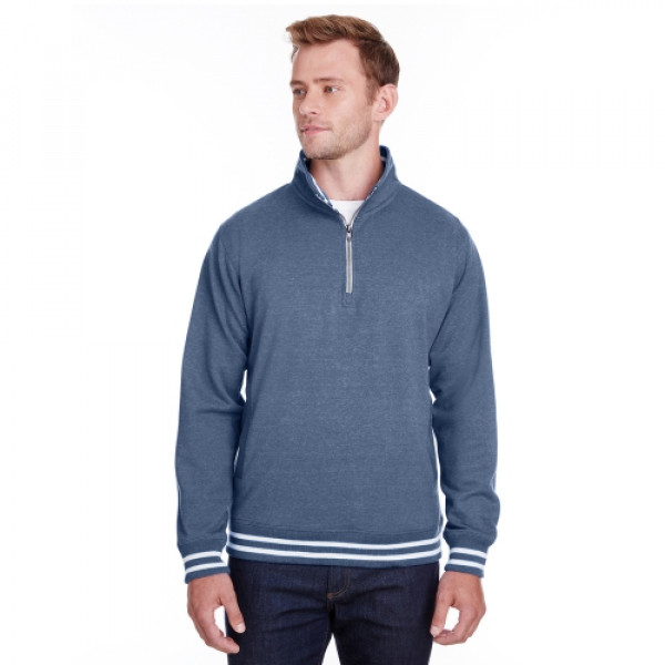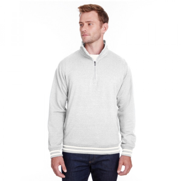 ::6.5 oz., 60% cotton 40% polyester single-dyed fleece::1x1 rib yarn-dyed stripe inside collar, cuffs and waist::Unconcealed brushed nickel ¼ zip placket::Self fabric side gussets with side welt pockets