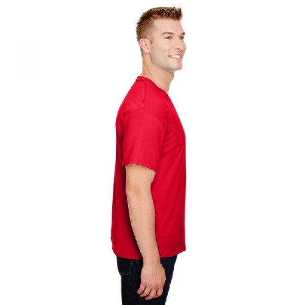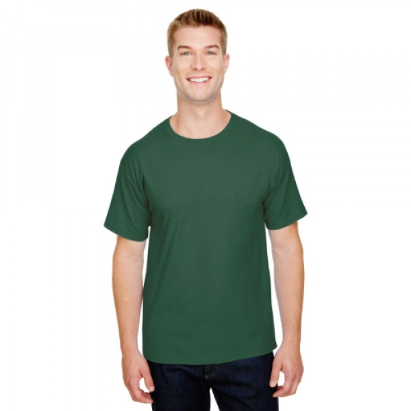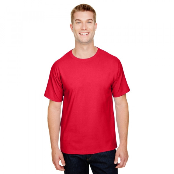 ::5 oz., 100% ringspun cotton::Charcoal heather is 60% cotton, 40% polyester::Tag-free neck label::Shoulder-to-shoulder neck tape::Double-needle sleeves and bottom hem::"C" logo on left sleeve::Side seamed and shaped