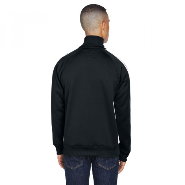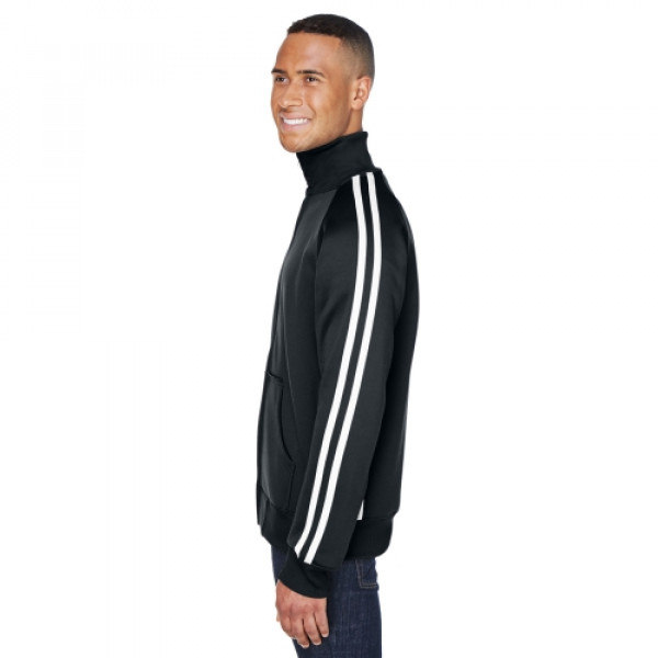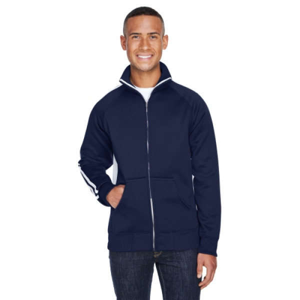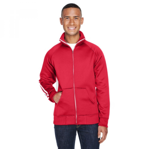 Fabric:::9.75 oz. 70% Polyester, 30% Cotton fleece fabric::9.8 oz., 70% polyester 30% cotton fleeceFeatures:::Contrast color side gussets and sleeve stripes::Split front pocket pocket::Raglan sleeves::Rib waist, cuffs, and collar::Flatlock coverstitched throughout::Raw-edge seams on pocket