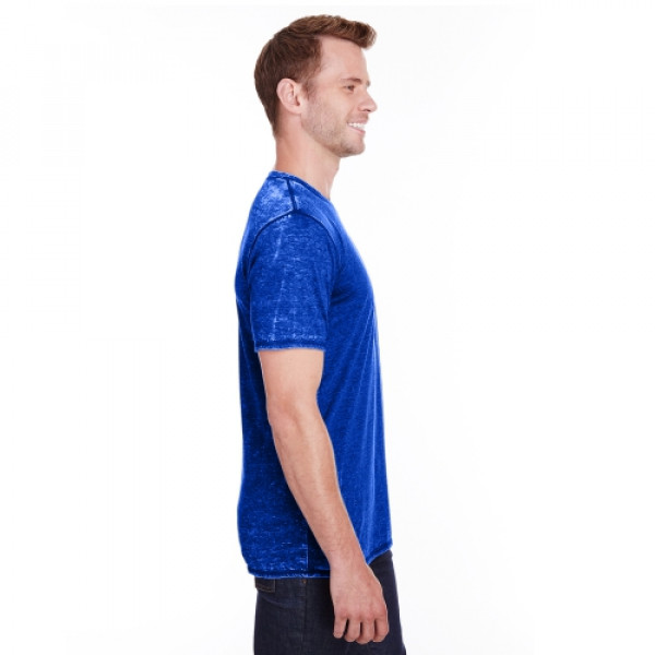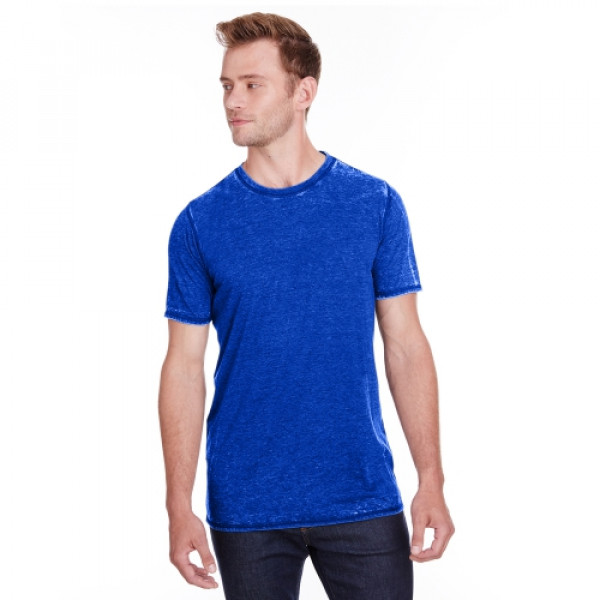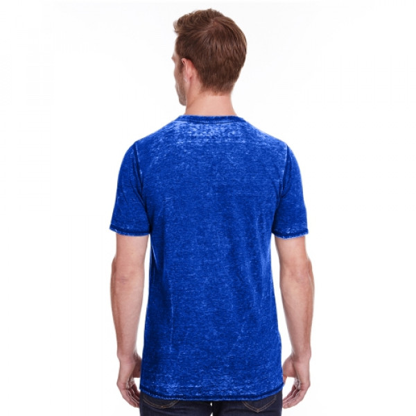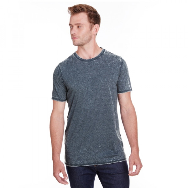 ::4 oz., 50% cotton 50% polyester burnout jersey::Acid washed with silicone finish::Self fabric collar::Flatlock stitching throughout