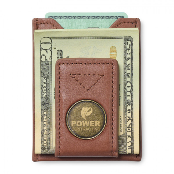 A sleek, genuine leather credit card holder featuring a built-in money clip and permanently mounted ball marker—perfect for staying organized on and off the course. This sharp promotional product can be custom decorated or branded with your logo, making it a memorable giveaway for clients, events, or business functions.