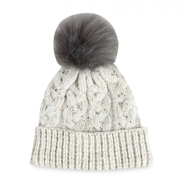 - Subtle speckled pattern with pom-pom accent