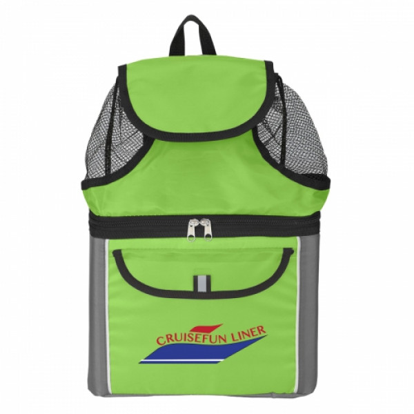 ::Made Of 210D Polyester::Adjustable Padded Shoulder Straps And Web Carrying Handle::Loop For Attaching Pen Or Keys::Front Pocket With Hook And Loop Closure::Double Zippered Insulated Lower Compartment With PEVA Lining::Hook And Loop Flap Closure Upper Mesh Compartment::Drawstring Closure Under The Flap::Hold Up To 6 Cans::Spot Clean/Air Dry