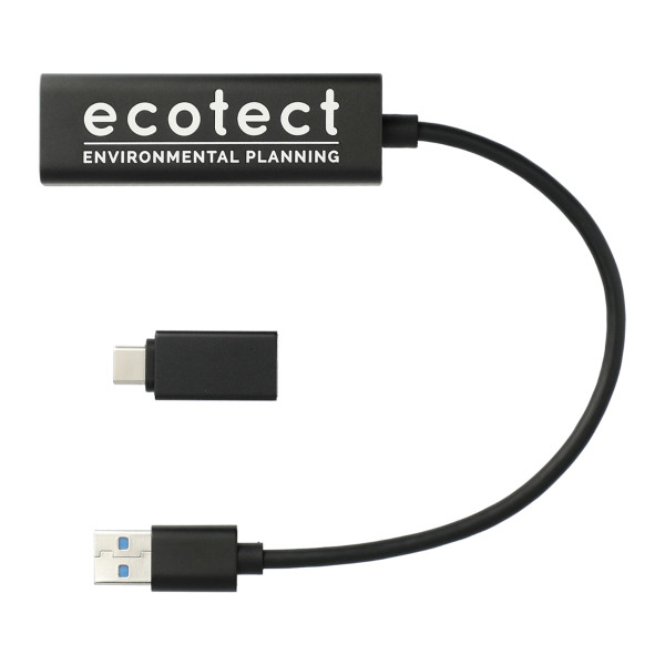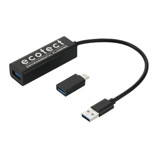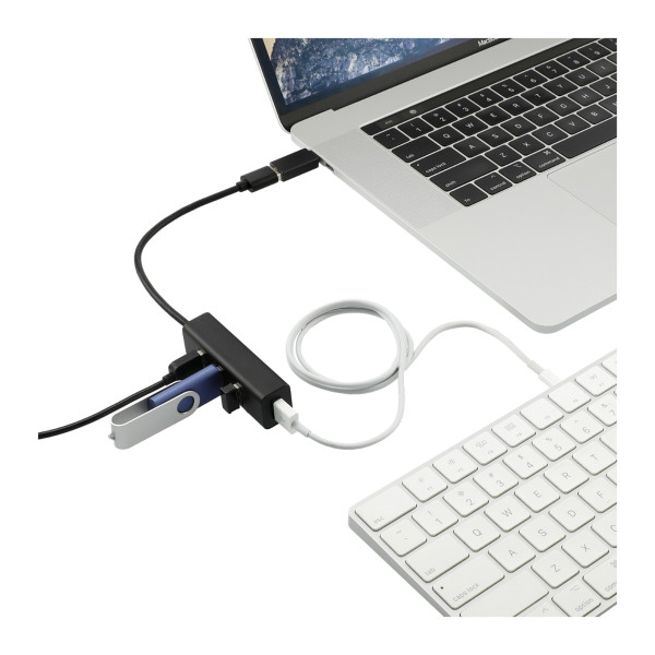 The Aluminum 4-Port USB 3.0 Hub with Type C Adapter features a hub with four USB-A outputs and a Type-C adapter, making it compatible with computers and other electronic devices, like mouses, flash drives, keyboard and more.