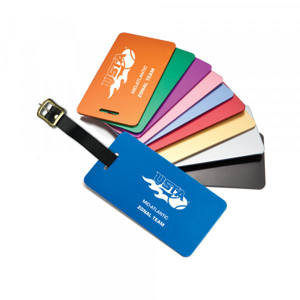 Aluminum bag tag is laser engraved with your logo or event and is available in 10 bold metallic colors. Includes black leather buckle strap.