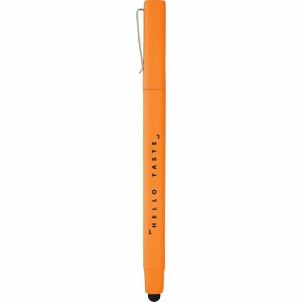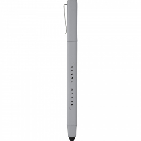 Square barrel with removable pen cap. Metal pen clip allows for this pen to be inserted into a journal spine or on front cover. Soft, rubber stylus. Includes premium black ballpoint ink cartridge.